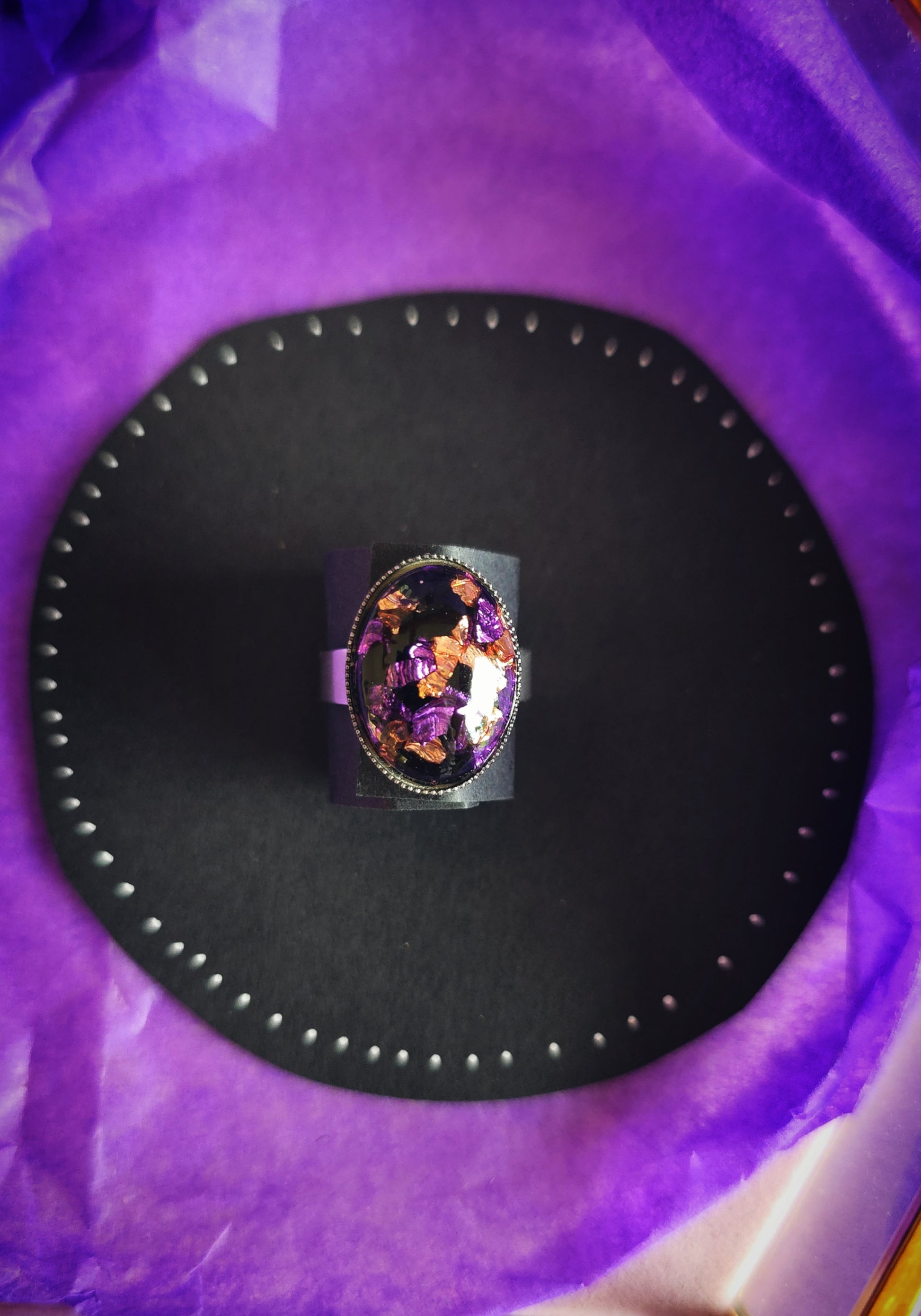 Cabochon 13x18mm réalisé à la main avec de véritables éclats de verres colorés (noir, violet et or).
