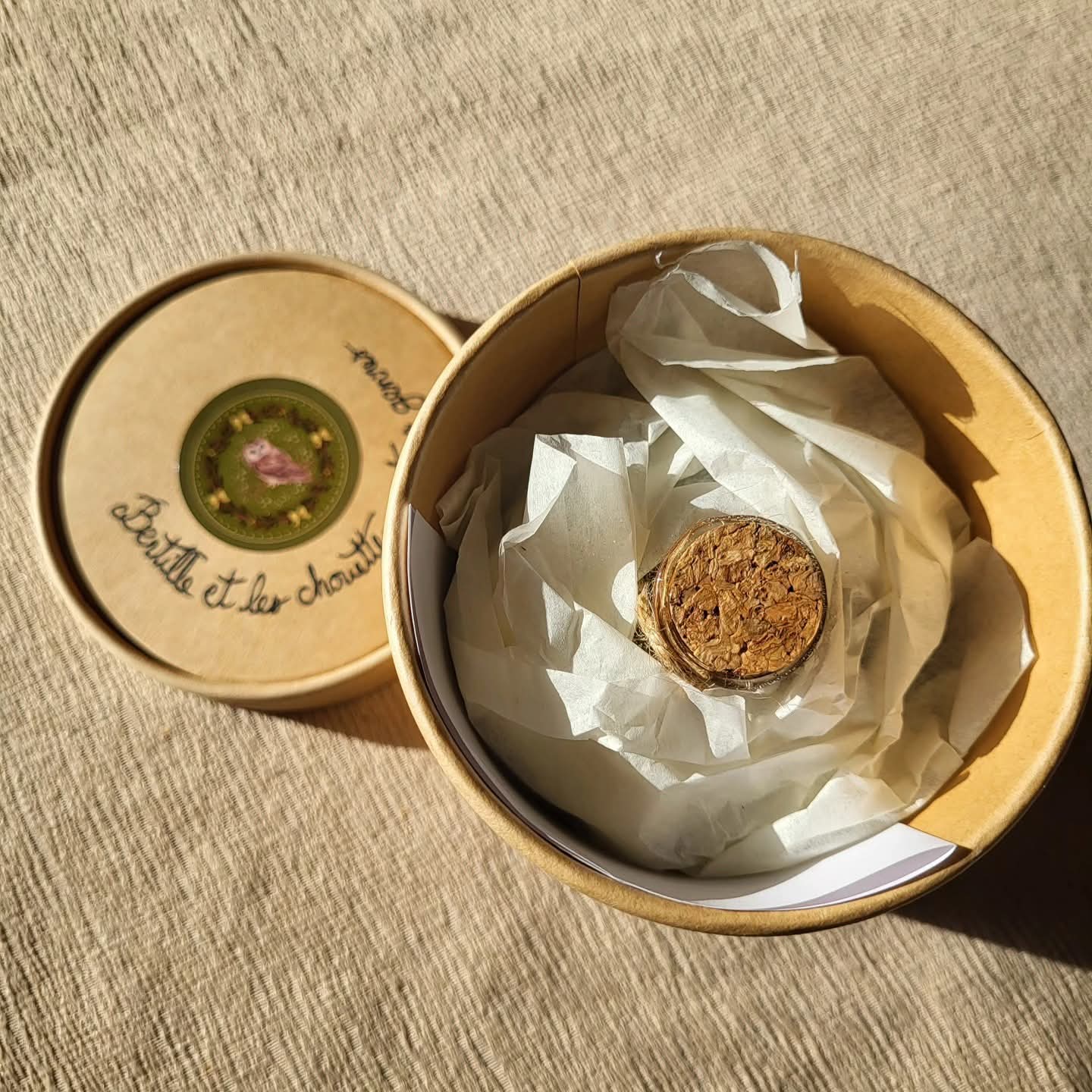 À l'intérieur vous y retrouverez la magie des 4 Vents, des feuilles de forêt, du houx d'or, de la sauge, une plume de Cailloutte, du gypsophile noir, une formule magique écrite à la main, du ruban vert et bien évidemment la petite lanterne qu"utilise Bertille pour traverser la forêt 😊
